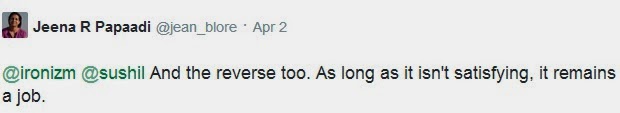 A few days ago I had a discussion with Twitter buddies regarding Job Satisfaction. Several interesting thoughts came up from everyone, and I do not want to lose those. Here they are: