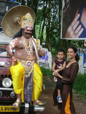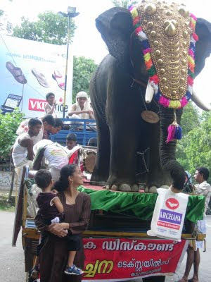 We managed to meet King Mahabali and an elephant on the way. Munnu was excited ! The elephant isn’t real, by the way – though the King is. Both were advertising “Archana Textiles.”
